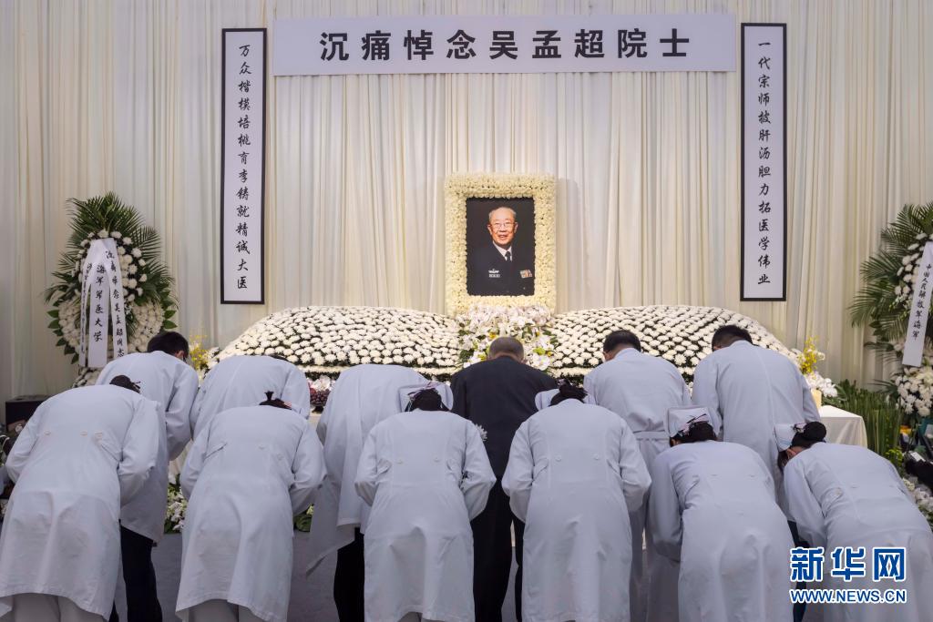 5月23日,人们鞠躬吊唁吴孟超院士。 5月23日至25日,海军军医大学第三附属医院(上海东方肝胆外科医院)在上海市长海路225号三号楼广场为吴孟超院士设置灵堂,接受吊唁。 新华社记者 王翔 摄