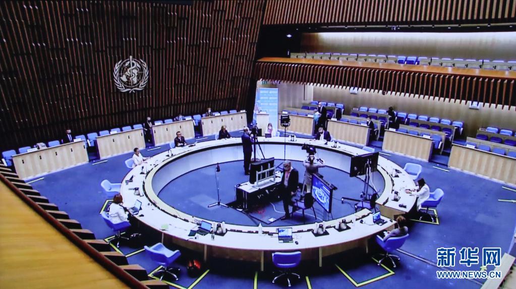 第74届世界卫生大会24日开幕。这是位于瑞士日内瓦的世界卫生组织总部会议现场(翻拍视频画面)。新华社记者 郑焕松 摄