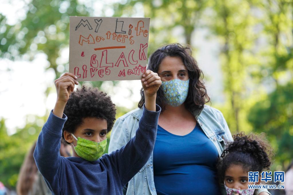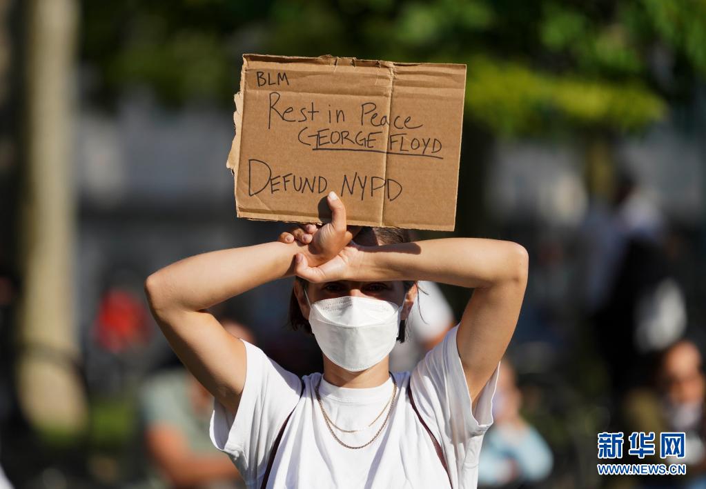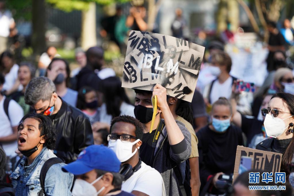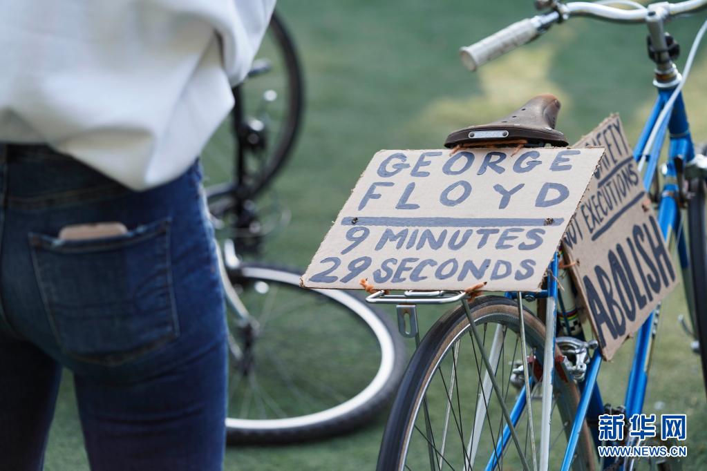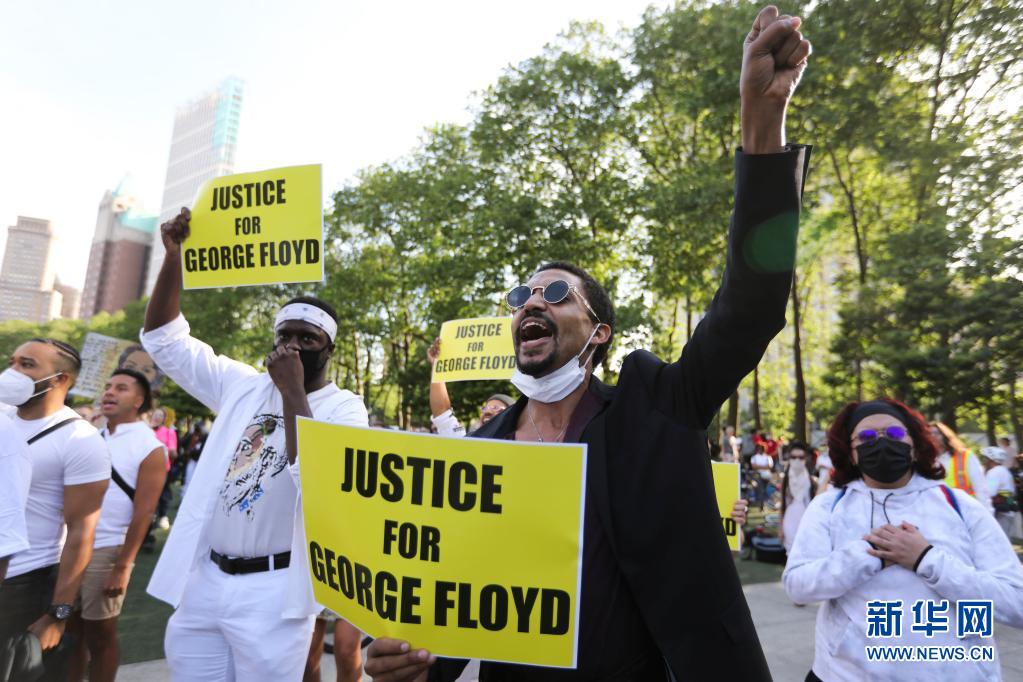 这是5月25日在美国纽约卡德曼广场公园悼念弗洛伊德的集会上拍摄的标语牌。 当日是非洲裔美国人乔治·弗洛伊德遭明尼苏达州白人警察“跪颈”执法致死一周年,美国多地举行悼念活动。 新华社记者 王迎 摄