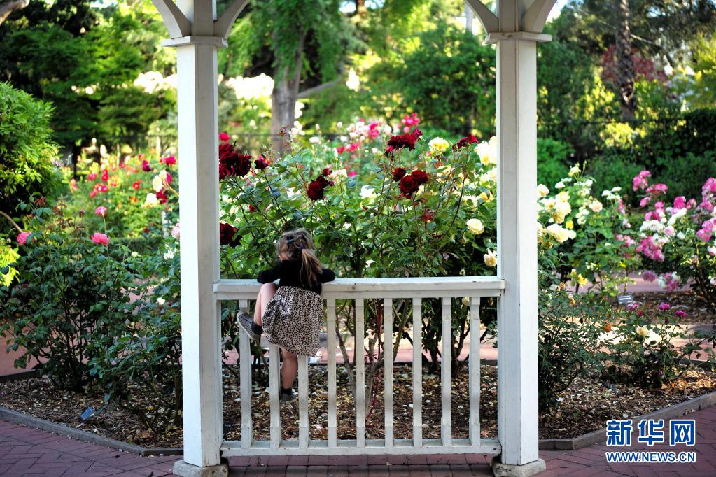 5月28日,在美国加利福尼亚州北部圣马特奥中央公园的花园里,一名女孩在凉亭里赏花。新华社记者 吴晓凌 摄