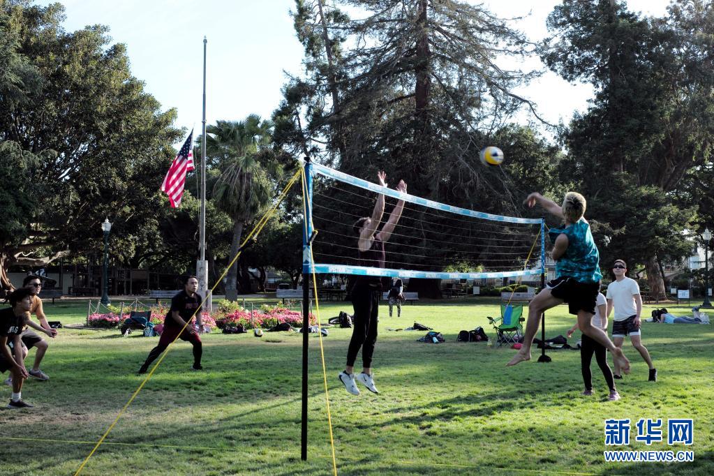 5月28日,人们在美国加利福尼亚州北部圣马特奥中央公园的草坪上打排球。新华社记者 吴晓凌 摄