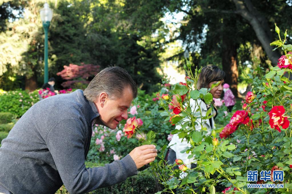 5月28日,在美国加利福尼亚州北部圣马特奥中央公园的花园里,一名男子在闻花香。新华社记者 吴晓凌 摄 |