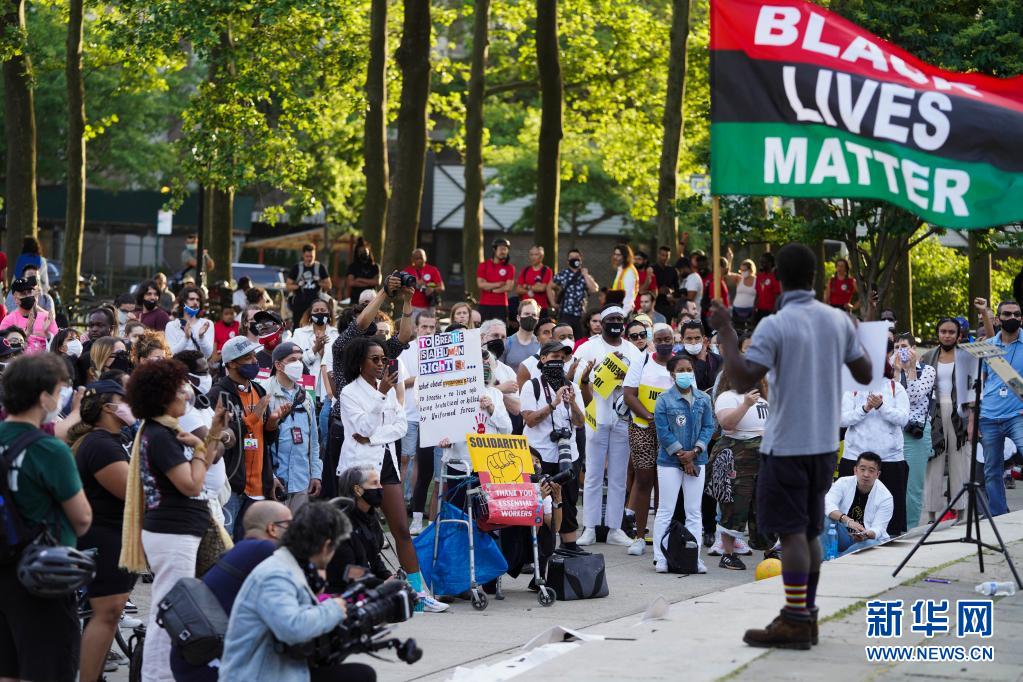 5月25日,人们在美国纽约的卡德曼广场公园参加悼念弗洛伊德的集会。 当日是非洲裔美国人乔治·弗洛伊德遭明尼苏达州白人警察“跪颈”执法致死一周年,美国多地举行悼念活动。 新华社记者 王迎 摄