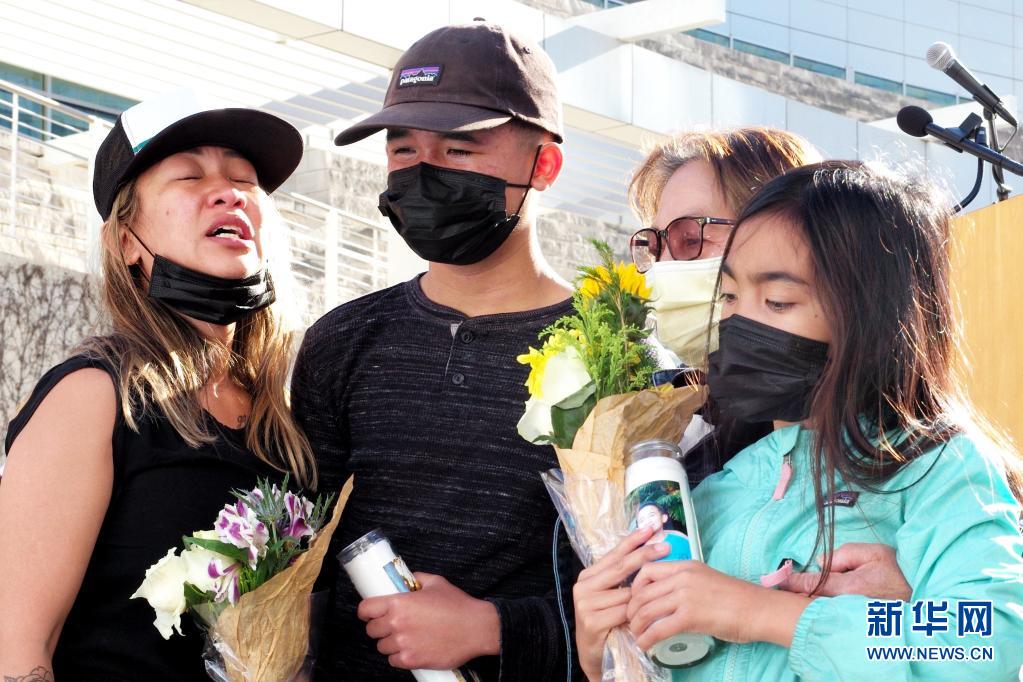 5月27日,遇难者亲属在美国加利福尼亚州圣何塞市政厅广场参加悼念仪式。 美国加利福尼亚州北部城市圣何塞市圣克拉拉谷交通管理局一处轻轨设施26日发生的枪击事件造成9人死亡,枪手在案发现场自杀身亡。 新华社记者 吴晓凌 摄