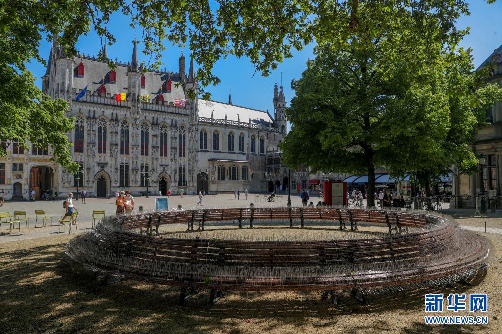 6月1日,人们在比利时布鲁日观看一处装置艺术。