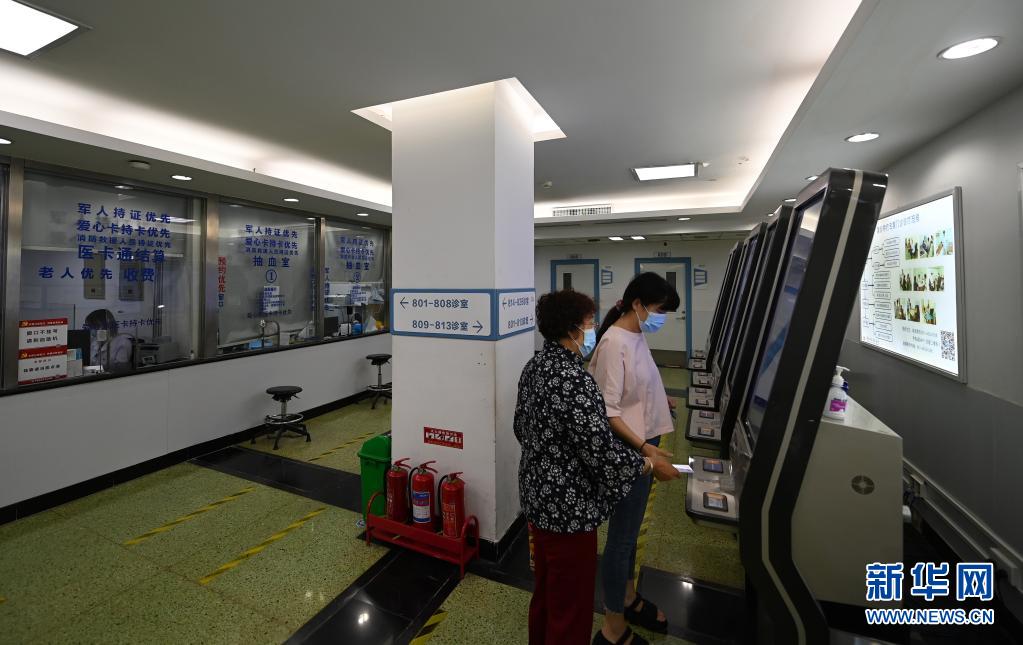 到夜间门诊就医的患者在天津医科大学总医院自助机上挂号(6月2日摄)。