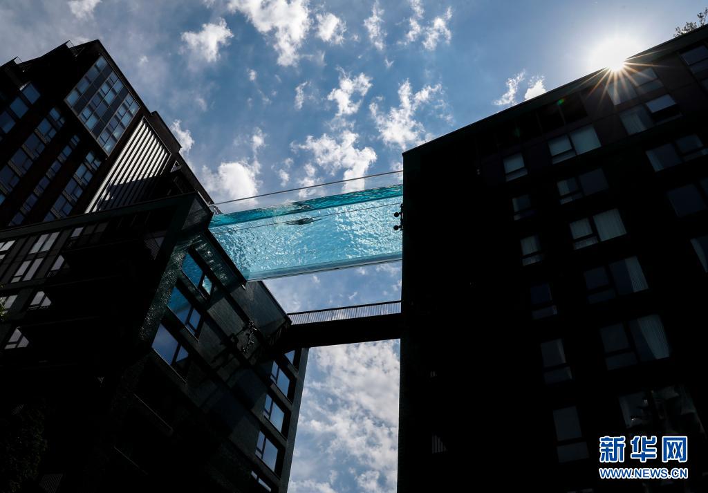 6月2日,一名男子在英国伦敦南部一个建造于两栋公寓楼之间的“空中泳池”游泳。