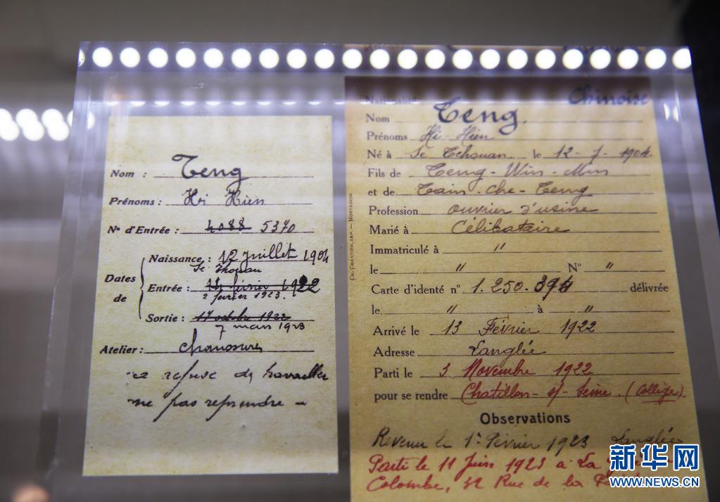 这是2021年3月22日在中国旅法勤工俭学蒙达尔纪纪念馆拍摄的邓小平当年在法国的居留登记卡和工作档案卡。新华社记者 高静 摄
