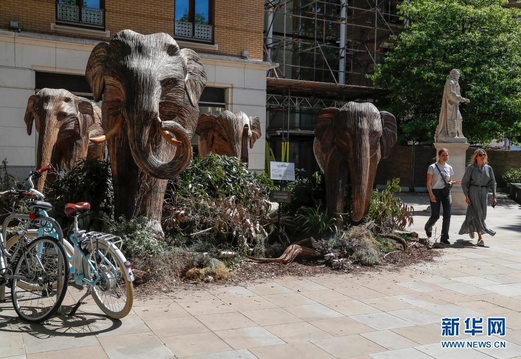 6月8日,行人从在英国伦敦切尔西街头摆放的大象艺术品旁走过。