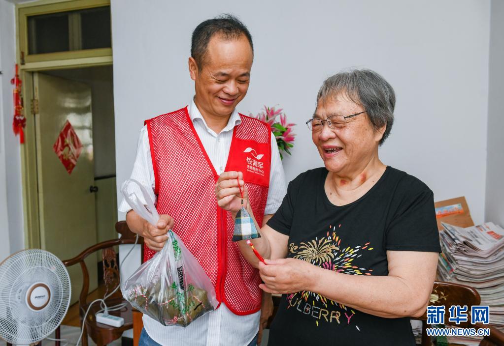 6月9日,志愿者给结对的81岁的朱春芬老人(右)送上端午节的玉米、粽子和香囊,共迎端午。 当日,浙江省慈溪市钱海军志愿服务中心的志愿者们来到慈溪市崇寿镇海运村,帮助该村低保户老人一起收获玉米,并用爱心基金将收获的900多斤玉米全部买下。同时该中心组织志愿者们将这些收购的玉米赠予与该中心结对的数十户孤寡、空巢老人和老劳模,既帮助低保户完成售卖,又为结对老人们送去端午佳节的祝福。 新华社记者 徐昱 摄