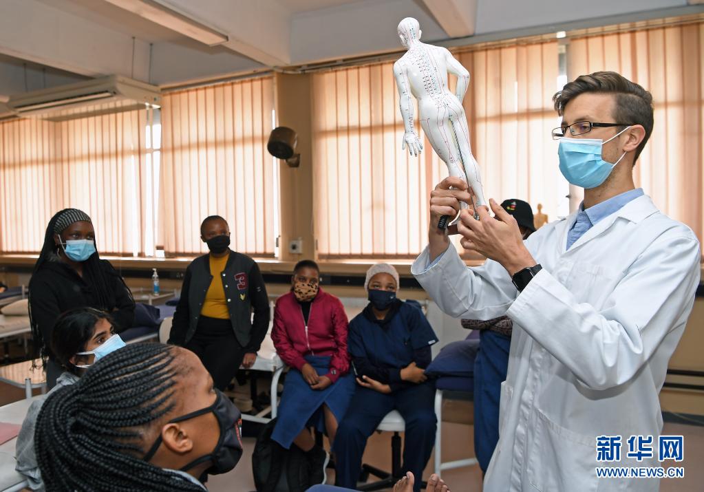 6月9日,针灸课助理教师达伦在南非约翰内斯堡大学给同学们讲解人体穴位知识。 南非约翰内斯堡大学2020年2月正式开设针灸课,十分受学生们欢迎。随着南非新冠疫情逐步好转,针灸课程恢复线下面对面教学,每周会有一到两次线下课程,让老师能更好地为同学们答疑解惑。 新华社记者 陈诚 摄