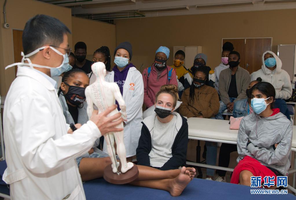 6月9日,针灸课老师胡紫景在南非约翰内斯堡大学给同学们讲解人体穴位分布。