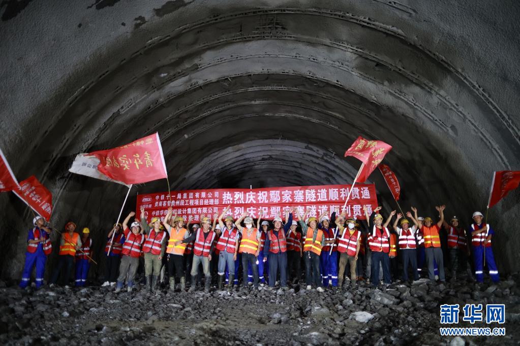 6月14日,工作人员庆祝鄢家寨隧道贯通。新华社记者 刘续 摄