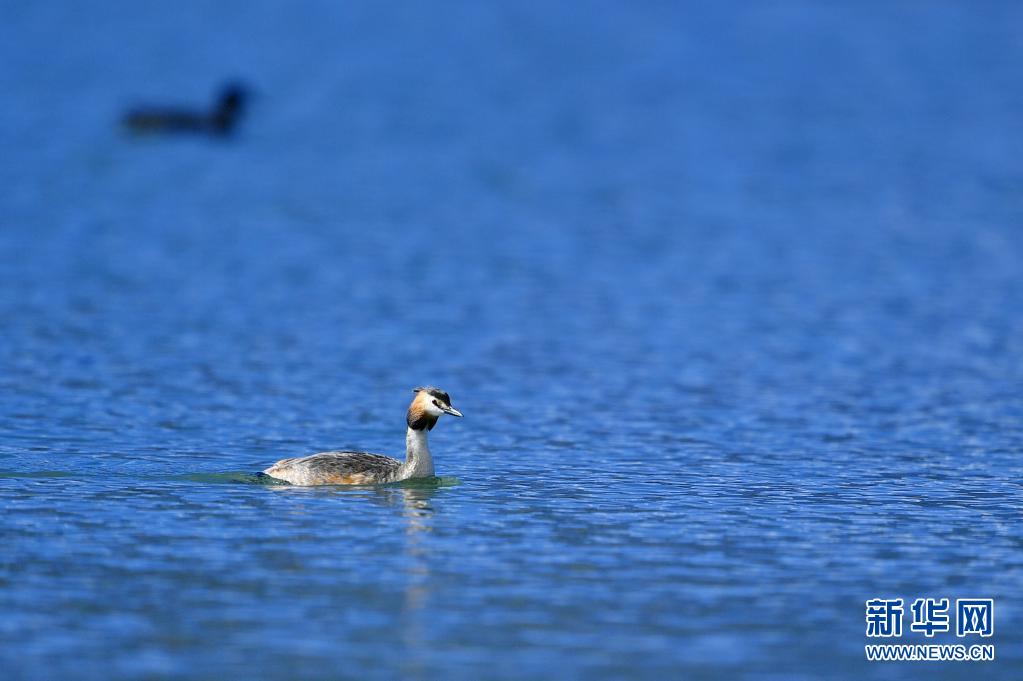 6月14日在拉鲁湿地拍摄的凤头  。夏日里,凤头  和小  在西藏拉萨拉鲁湿地国家级自然保护区水面上嬉戏。新华社记者 张汝锋 摄