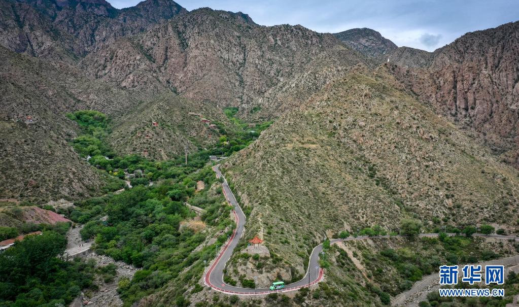 6月14日,游客在宁夏银川市贺兰山滚钟口风景区乘坐观光车游览(无人机照片)。当日是端午假期第三天,不少游客来到宁夏银川市贺兰山滚钟口风景区游玩,感受大自然的气息。新华社记者 冯开华 摄