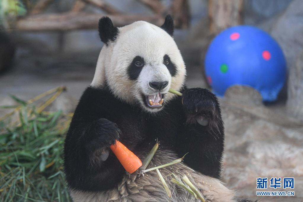 6月14日,在位于海口的海南热带野生动植物园,大熊猫“舜舜”享用美食。