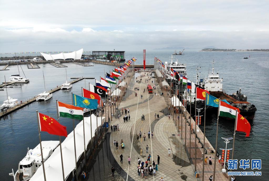 游客在青岛奥帆中心旗阵广场游览(2018年7月1日摄,无人机照片)。新华社记者 李紫恒 摄