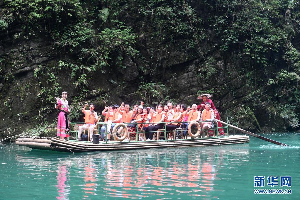 6月8日,游客乘坐竹筏在阿依河景区内游览。 新华社记者 唐奕 摄