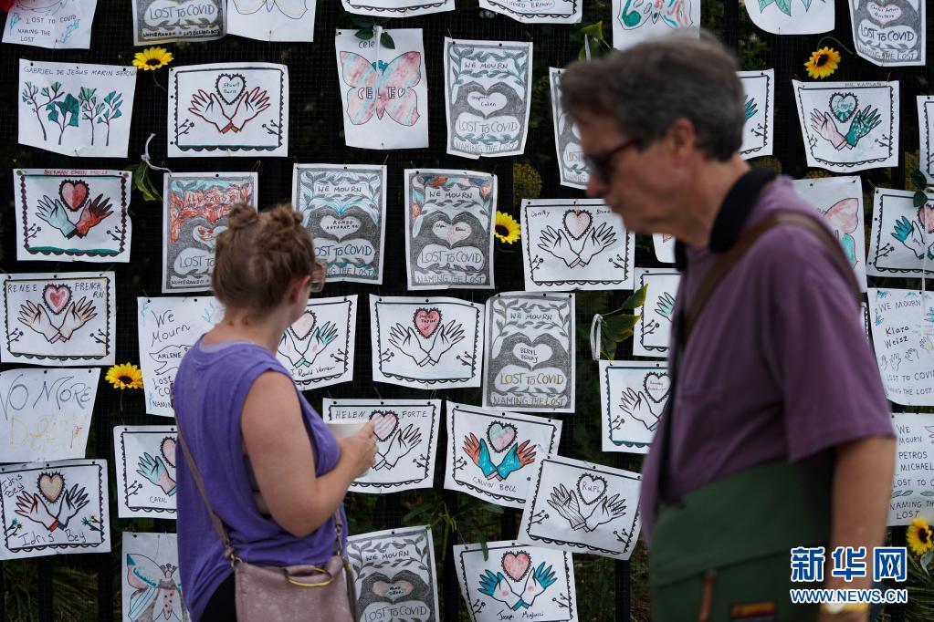 6月14日,行人从美国纽约一处墓地外为新冠死者设立的纪念装置旁走过。新华社记者王迎摄