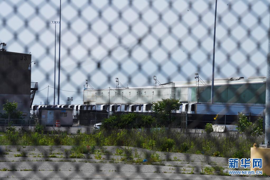 6月14日,在美国纽约布鲁克林,存放尸体的冷藏车停放在一处临时停尸场内。新华社记者王迎摄