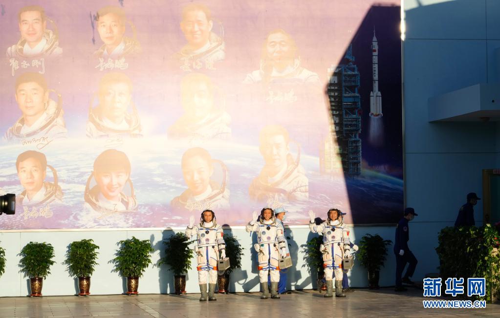 6月17日,神舟十二号航天员出征仪式在酒泉卫星发射中心举行。这是航天员聂海胜(中)、刘伯明(右)和汤洪波准备出征。新华社记者 李刚 摄