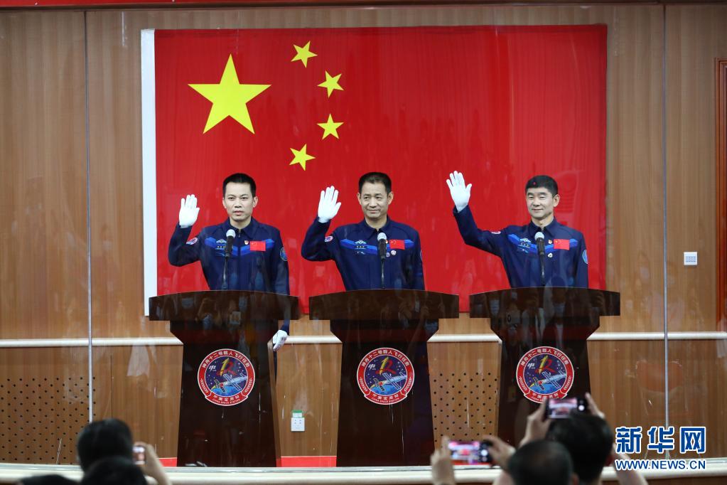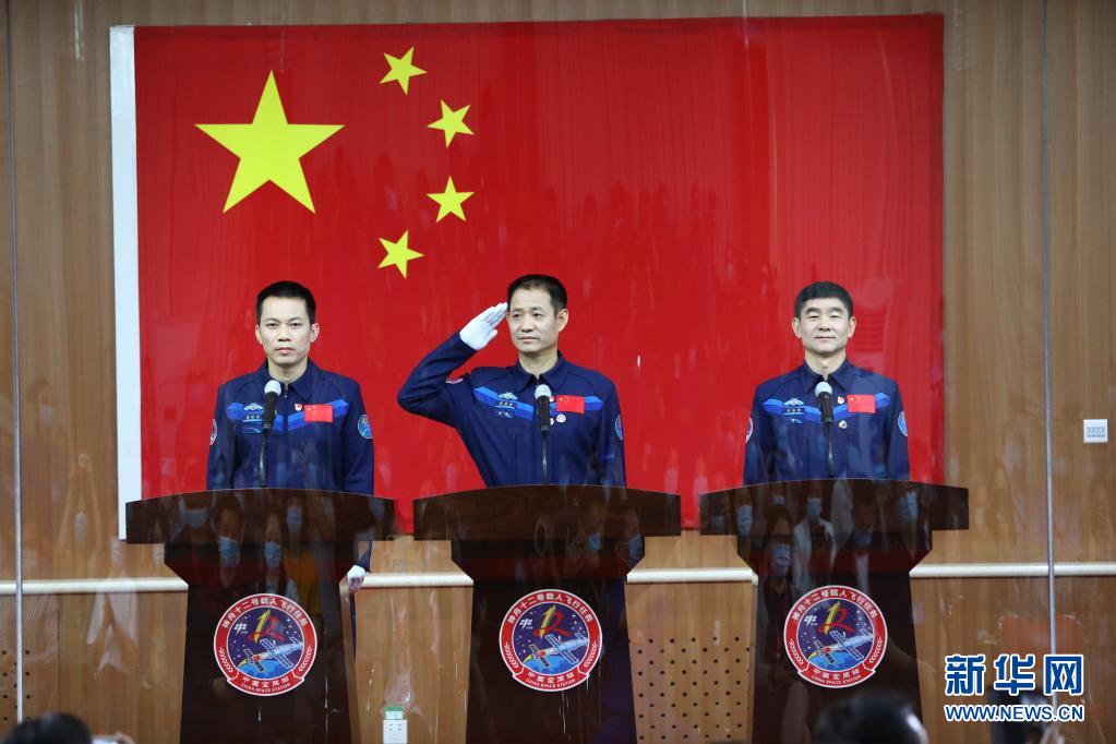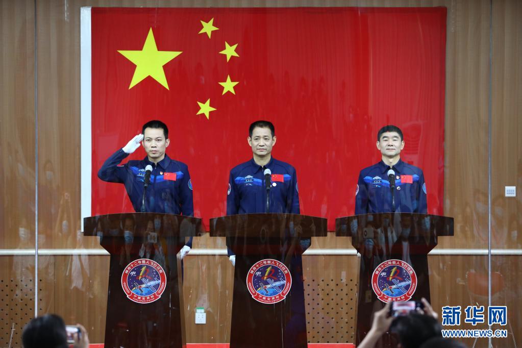 6月16日,神舟十二号载人飞行任务航天员聂海胜(中)、刘伯明(右)和汤洪波在酒泉卫星发射中心与记者见面。 新华社记者 琚振华 摄