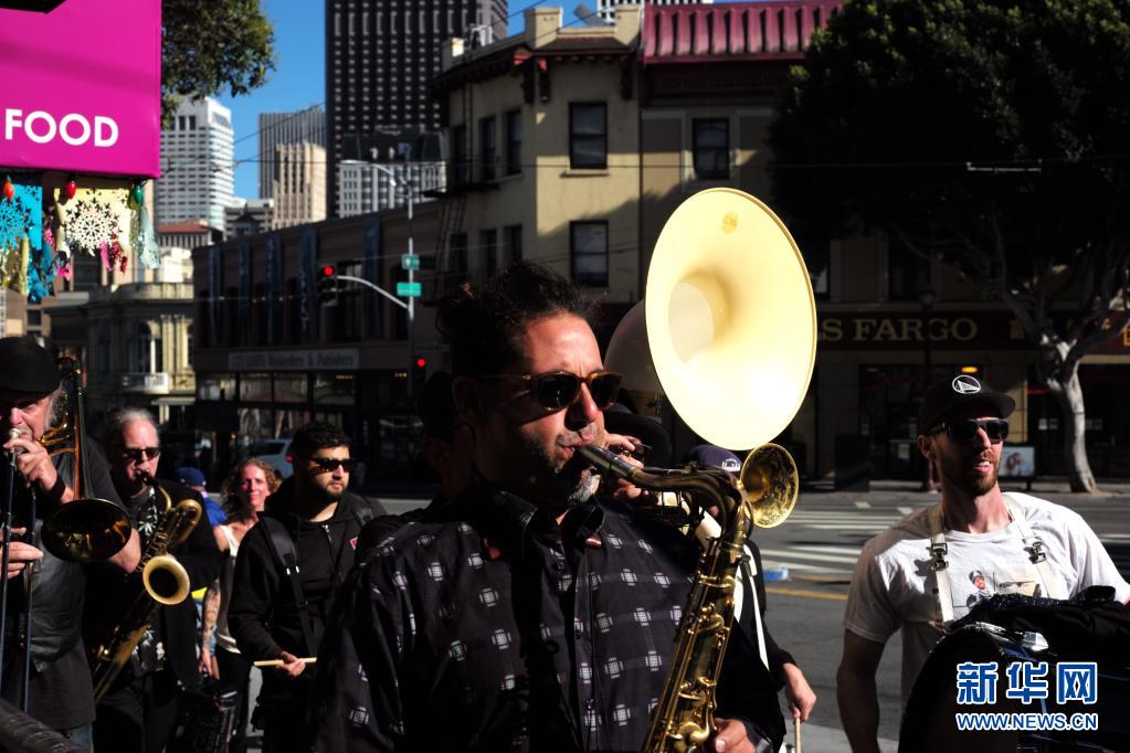 6月15日,一支乐队在美国加利福尼亚州旧金山街头演奏。 美国加州于6月15日解除防疫等级限制的相关规定,全面恢复开放经济活动。 新华社记者 吴晓凌 摄