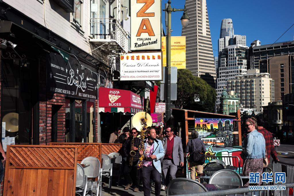 6月15日,一支乐队在美国加利福尼亚州旧金山街头演奏。