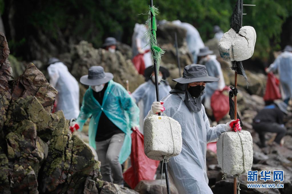 6月18日,工作人员在韩国灵兴岛海边清理海洋垃圾。