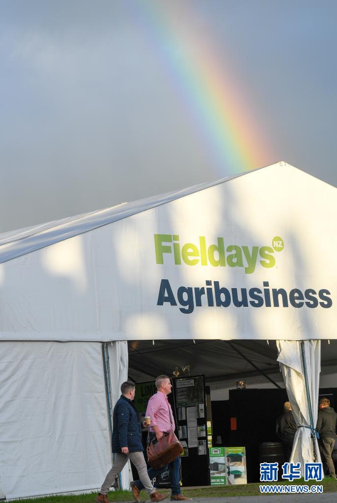 这是6月17日在新西兰汉密尔顿举行的国际农业博览会上拍摄的空中彩虹。