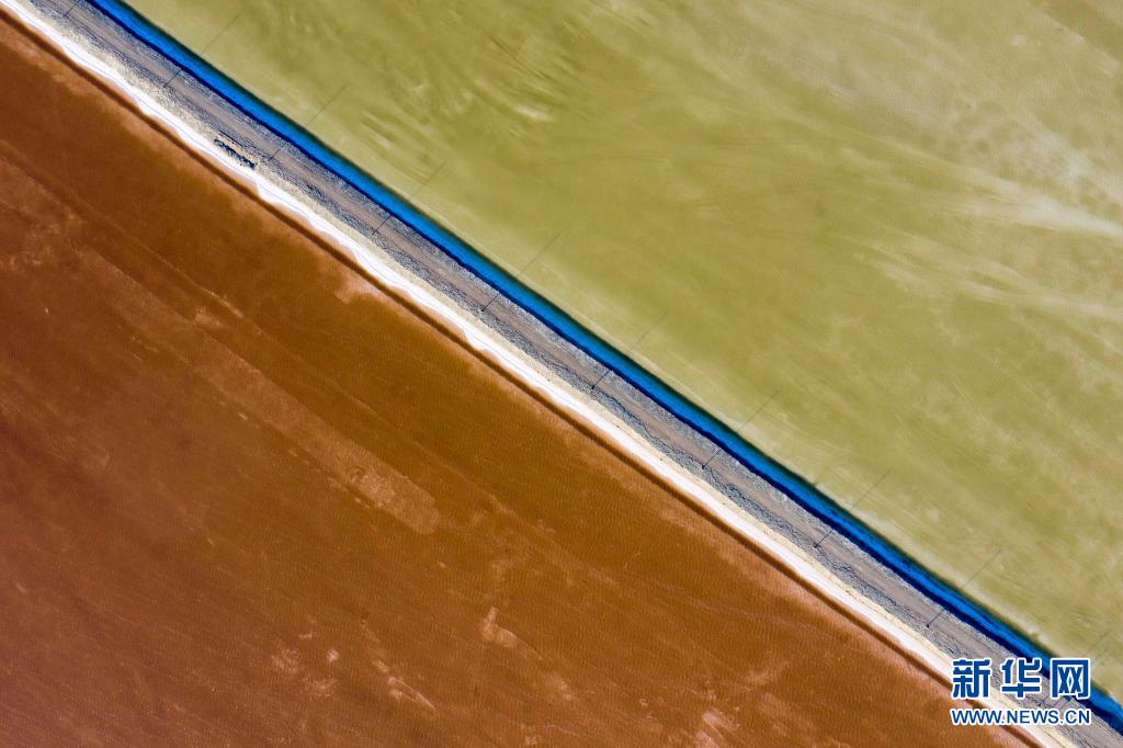 这是在新疆和布克赛尔蒙古自治县玛纳斯盐湖中盐宏达盐业生产基地拍摄的一处滩晒池(6月21日摄,无人机照片)。