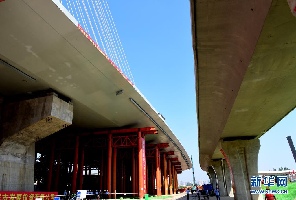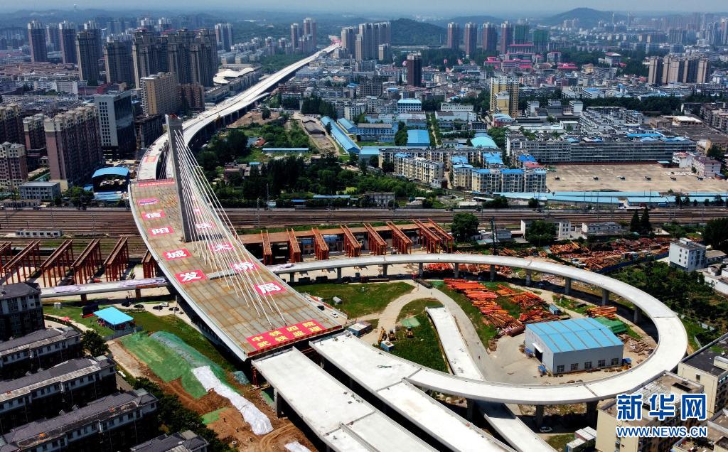 这是6月22日拍摄的成功转体后的河南信阳跨京广铁路斜拉桥(无人机照片)。 当日,由中铁大桥局承建的河南省信阳市跨京广铁路斜拉桥成功转体。转体主梁总长291米,总重量达1.96万吨。 新华社记者 朱祥 摄