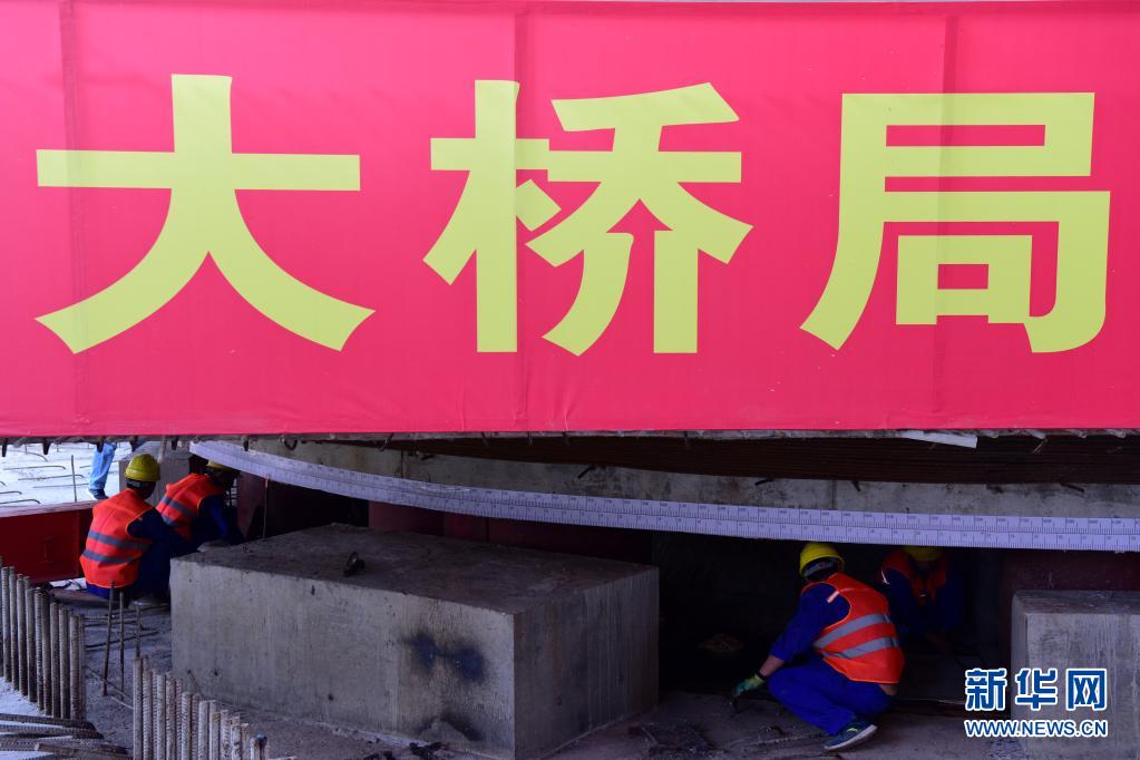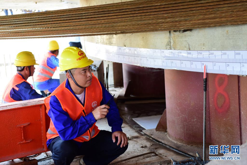6月22日,工程技术人员在河南信阳跨京广铁路斜拉桥转体施工现场作业。 当日,由中铁大桥局承建的河南省信阳市跨京广铁路斜拉桥成功转体。转体主梁总长291米,总重量达1.96万吨。 新华社记者 朱祥 摄