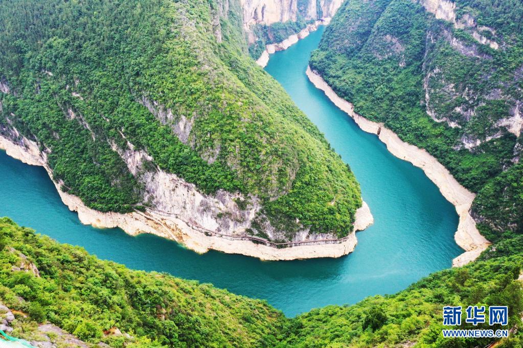 这是2020年5月26日拍摄的重庆市巫山县鱼头湾景象(无人机照片)。长江经济带沿江11省市大力推进生态环境整治,“共抓大保护、不搞大开发”,共同舞动高质量发展的“绿色长龙”。新华社记者 王全超 摄 中部长江经济带,沿江11省市大力推进生态环境整治,“共抓大保护、不搞大开发”,共同舞动高质量发展的“绿色长龙”;