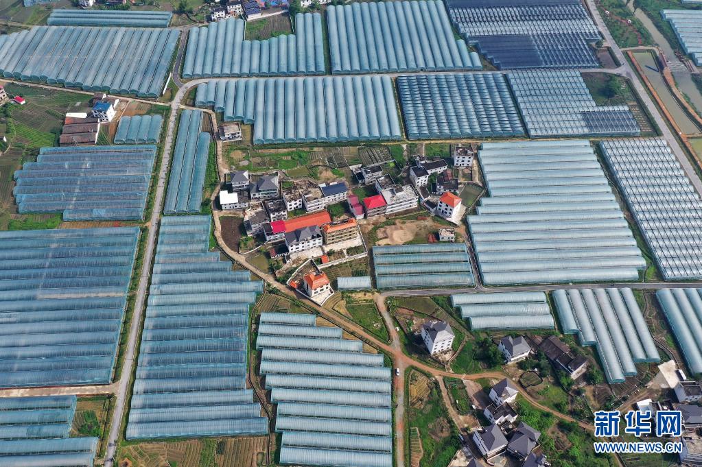 这是江西省于都县梓山镇潭头村的果蔬种植基地(4月29日摄,无人机照片)。新华社记者 万象 摄 江西于都,红军长征集结出发地。 初夏时分的梓山镇潭头村,现代化标准蔬菜大棚鳞次栉比,白墙黛瓦、绿树成荫,清池塘、景观亭点缀其间…… 昔日贫困村,脱贫后接力乡村振兴,种下富硒菜,吃上旅游饭,如今展现新颜。