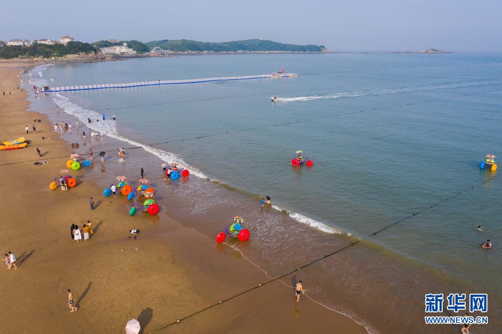 6月24日,游客在浙江省舟山市朱家尖南沙景区的沙滩上游玩(无人机照片)。
