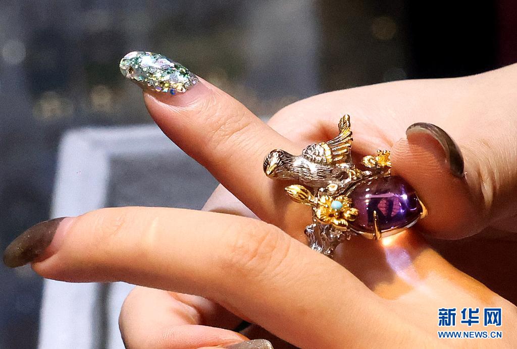 6月24日,参观者在上海国际珠宝首饰展览会上试戴彩色宝石戒指。 当日,2021上海国际珠宝首饰展览会在上海世博展览馆揭幕,来自世界各地的800多家参展商参展。 新华社记者 陈飞 摄