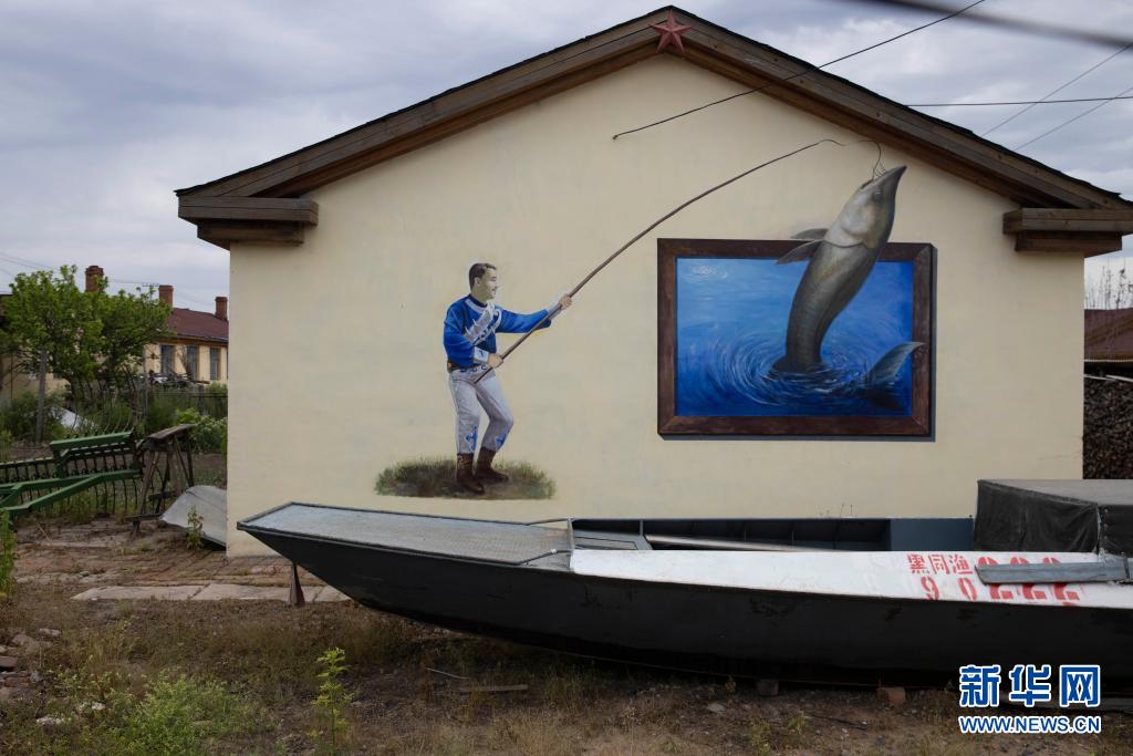 同江市街津口赫哲族乡住宅外墙上的特色壁画,展示了赫哲族的传统文化(6月17日摄)。新华社记者 张涛 摄