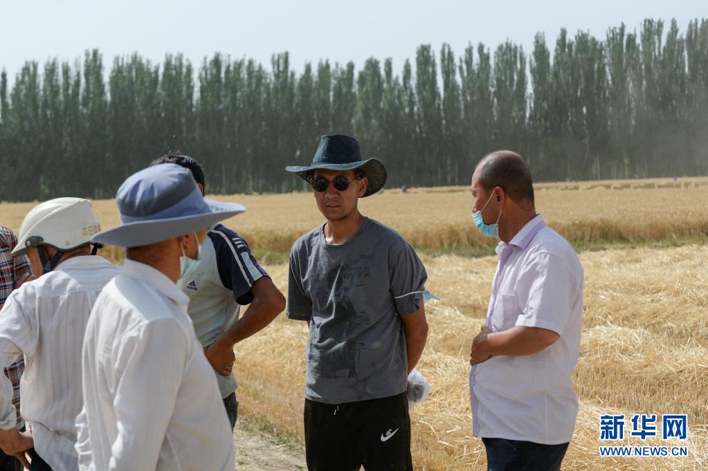 麦客阿地力·沙拉木(右二)在麦田里与麦农闲聊(6月19日摄)。新华社记者 高晗 摄