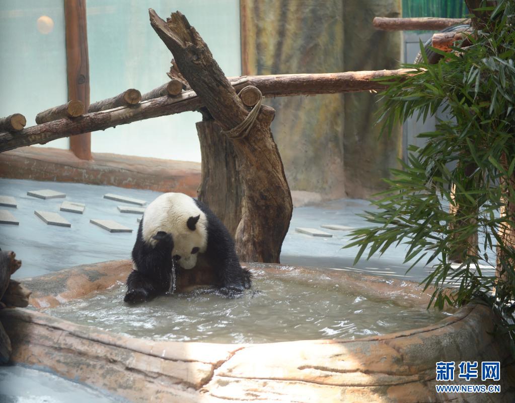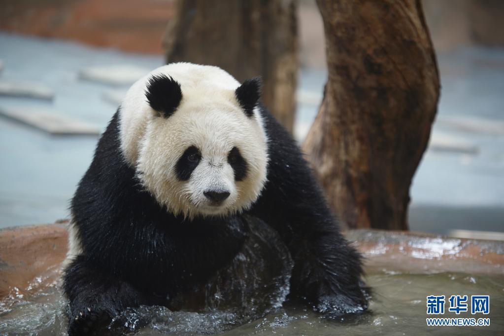 6月27日,在青海省西宁熊猫馆,大熊猫“园满”在水池中玩耍。 当日,在青海省西宁熊猫馆,大熊猫“奇果”“园满”迎来5岁生日会。工作人员用苹果、竹子等食物做成生日蛋糕和美食,还准备了不倒翁取食器等玩具为它们庆生。 新华社记者 张曼怡 摄