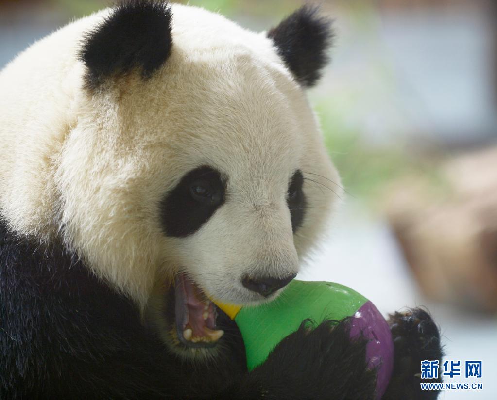 6月27日在青海省西宁熊猫馆拍摄的大熊猫“奇果”。 当日,在青海省西宁熊猫馆,大熊猫“奇果”“园满”迎来5岁生日会。工作人员用苹果、竹子等食物做成生日蛋糕和美食,还准备了不倒翁取食器等玩具为它们庆生。 新华社记者 张曼怡 摄