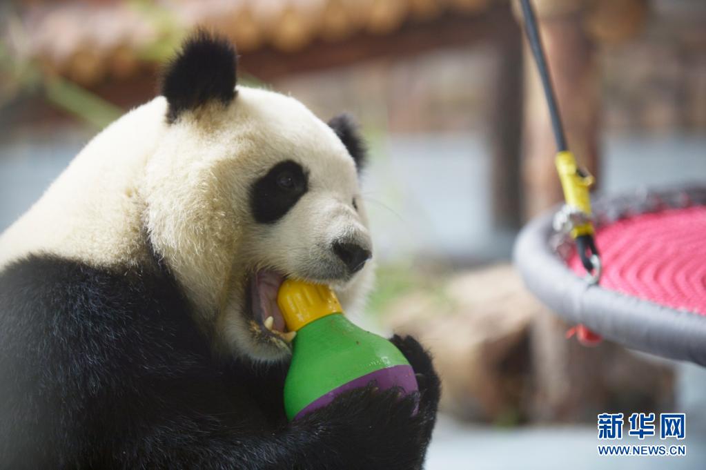 6月27日,在青海省西宁熊猫馆,大熊猫“奇果”在玩耍。 当日,在青海省西宁熊猫馆,大熊猫“奇果”“园满”迎来5岁生日会。工作人员用苹果、竹子等食物做成生日蛋糕和美食,还准备了不倒翁取食器等玩具为它们庆生。 新华社记者 张曼怡 摄
