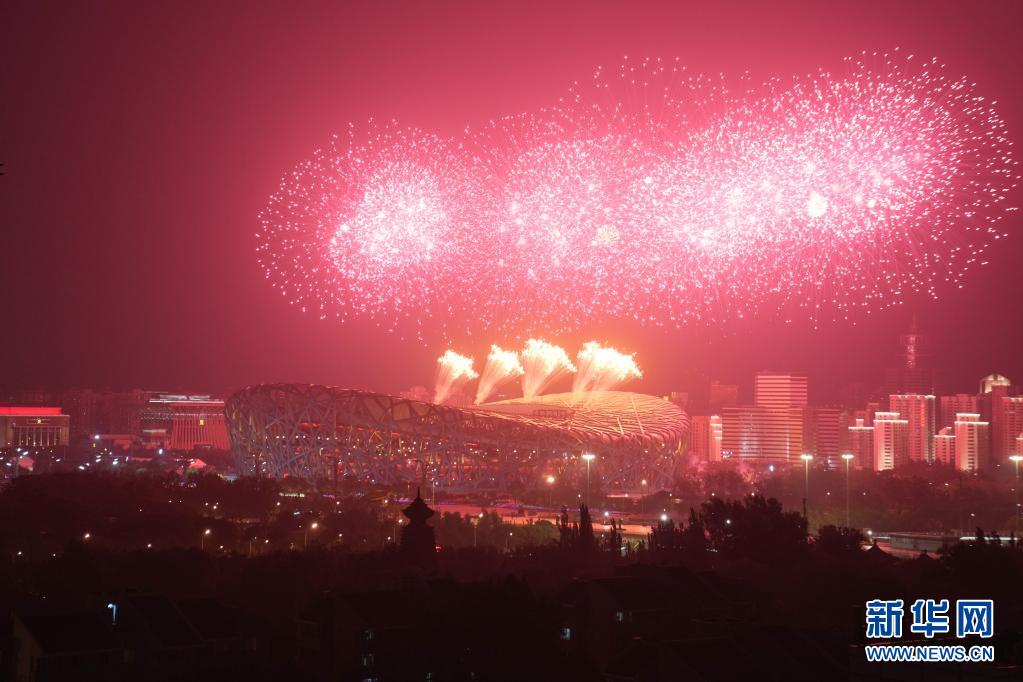 6月28日晚,庆祝中国共产党成立100周年文艺演出《伟大征程》在国家体育场盛大举行。这是焰火盛放在国家体育场上空。新华社记者 陈钟昊 摄