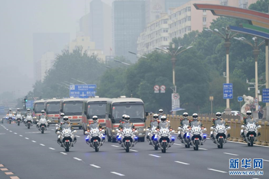 这是“七一勋章”获得者集体乘坐礼宾车从住地出发,由国宾护卫队护卫前往人民大会堂。