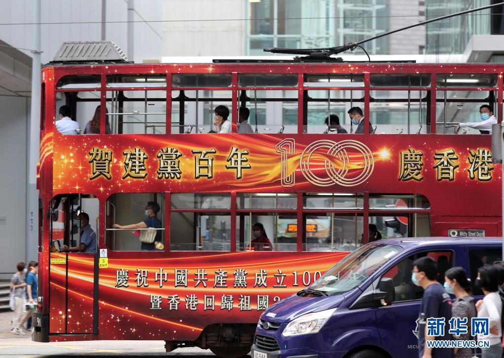 “七一”临近,香港街头出现许多“贺建党百年” “庆香港回归”的喜庆元素。新华社记者 李钢 摄