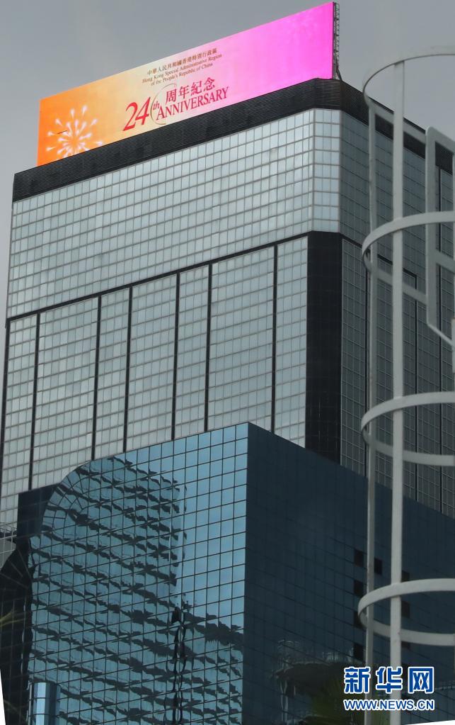 香港街头建筑物上电子屏显示的标语(6月29日摄)。