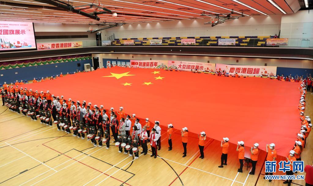 7月1日,在香港坑口体育馆,香港市民展示大型国旗。新华社记者 李钢 摄