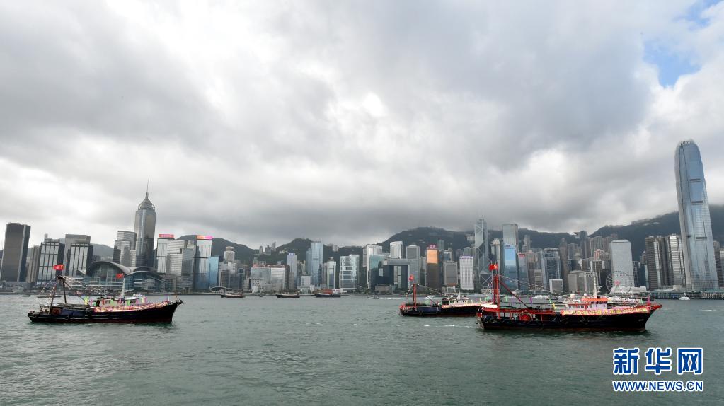 7月1日,悬挂国旗、区旗的渔船在维港巡游。新华社记者 卢炳辉 摄 |