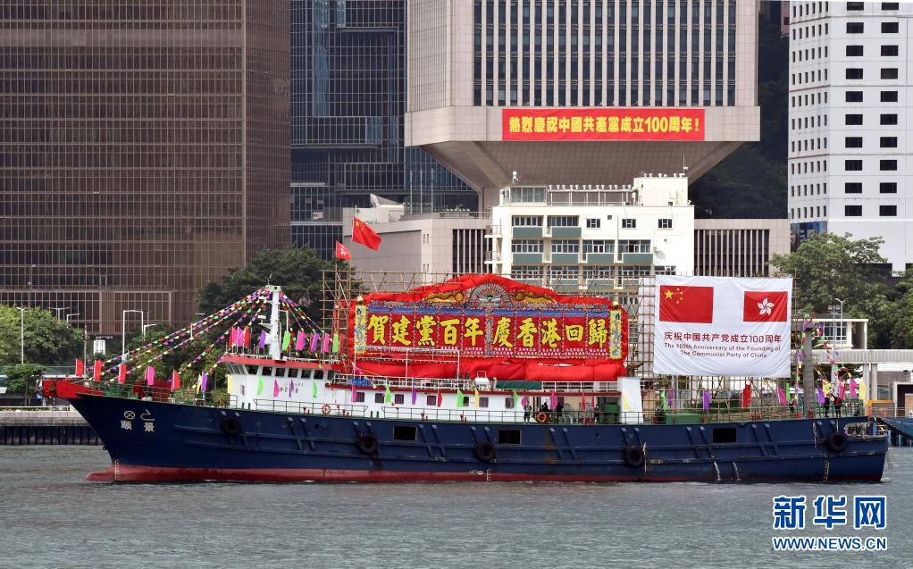 7月1日,悬挂国旗、区旗的渔船在维港巡游。新华社记者 卢炳辉 摄