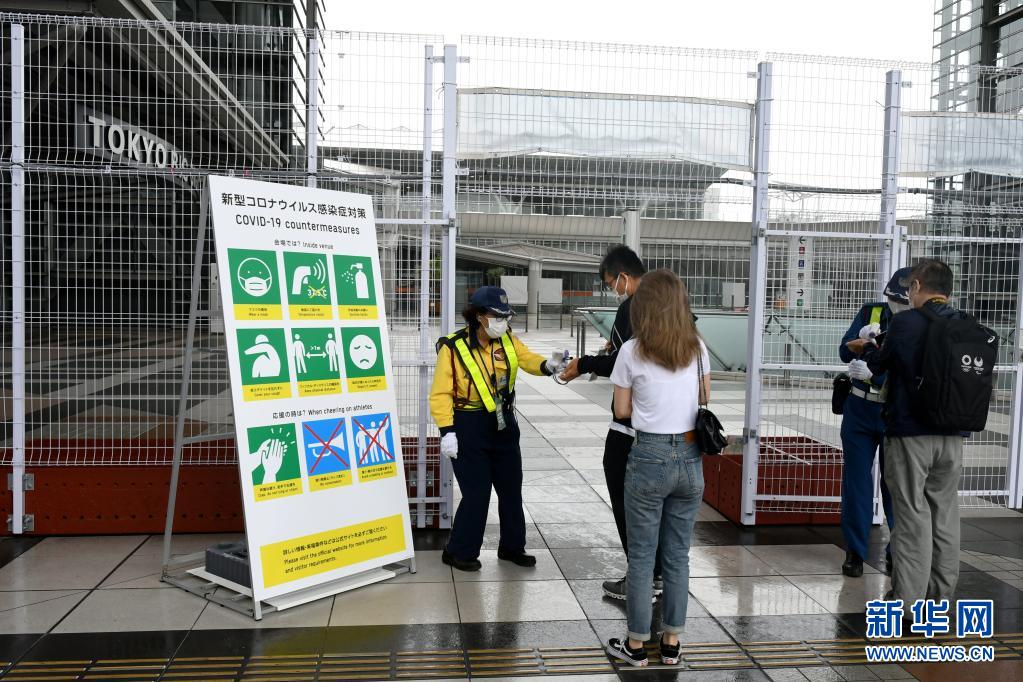 7月1日,工作人员在奥运会主新闻中心入口检查证件和测量体温。新华社记者 华义 摄